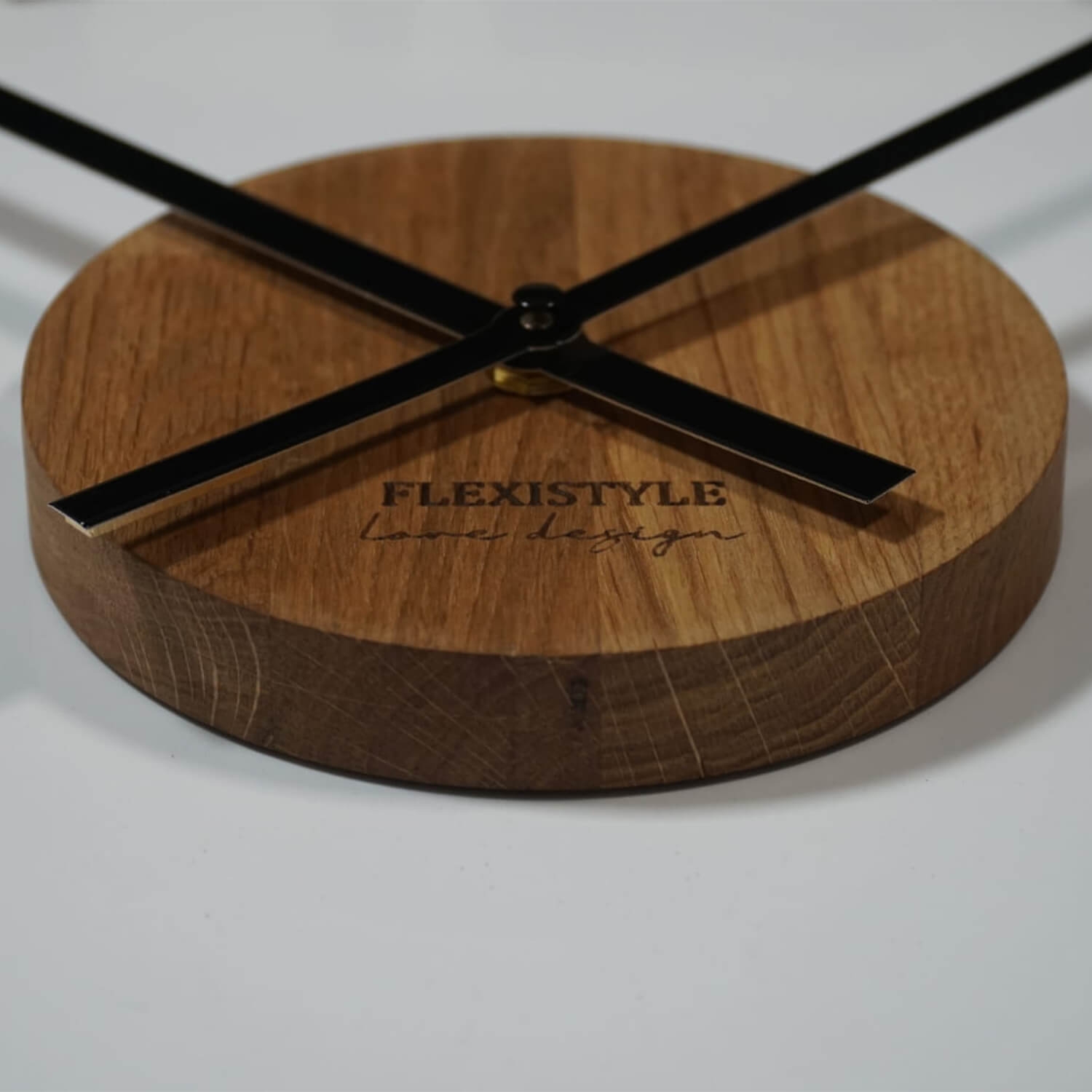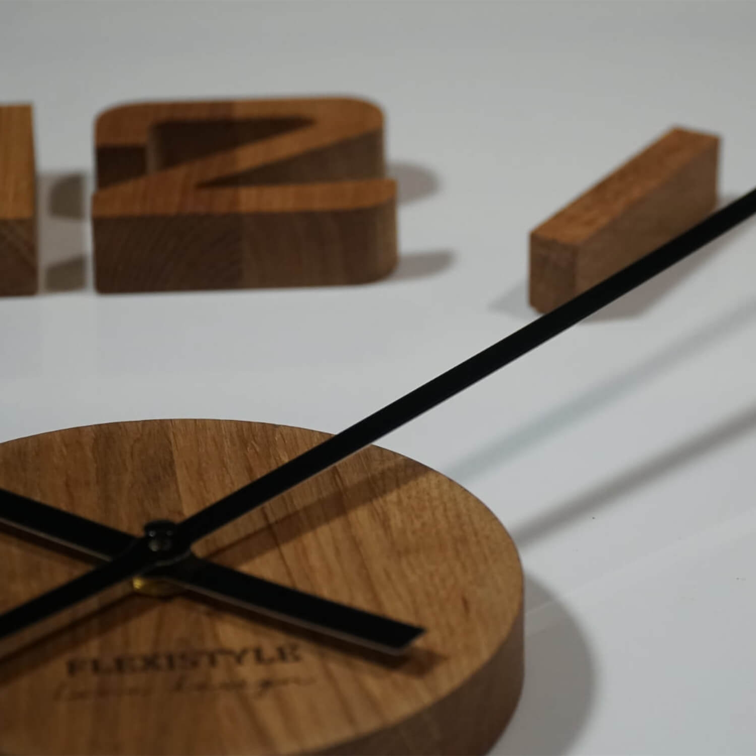 - Eleganter Kontrast: Die schwarzen Zeiger setzen akzentuierte Highlights auf dem natürlichen Eichenholz und betonen die Harmonie von Design und Funktion.