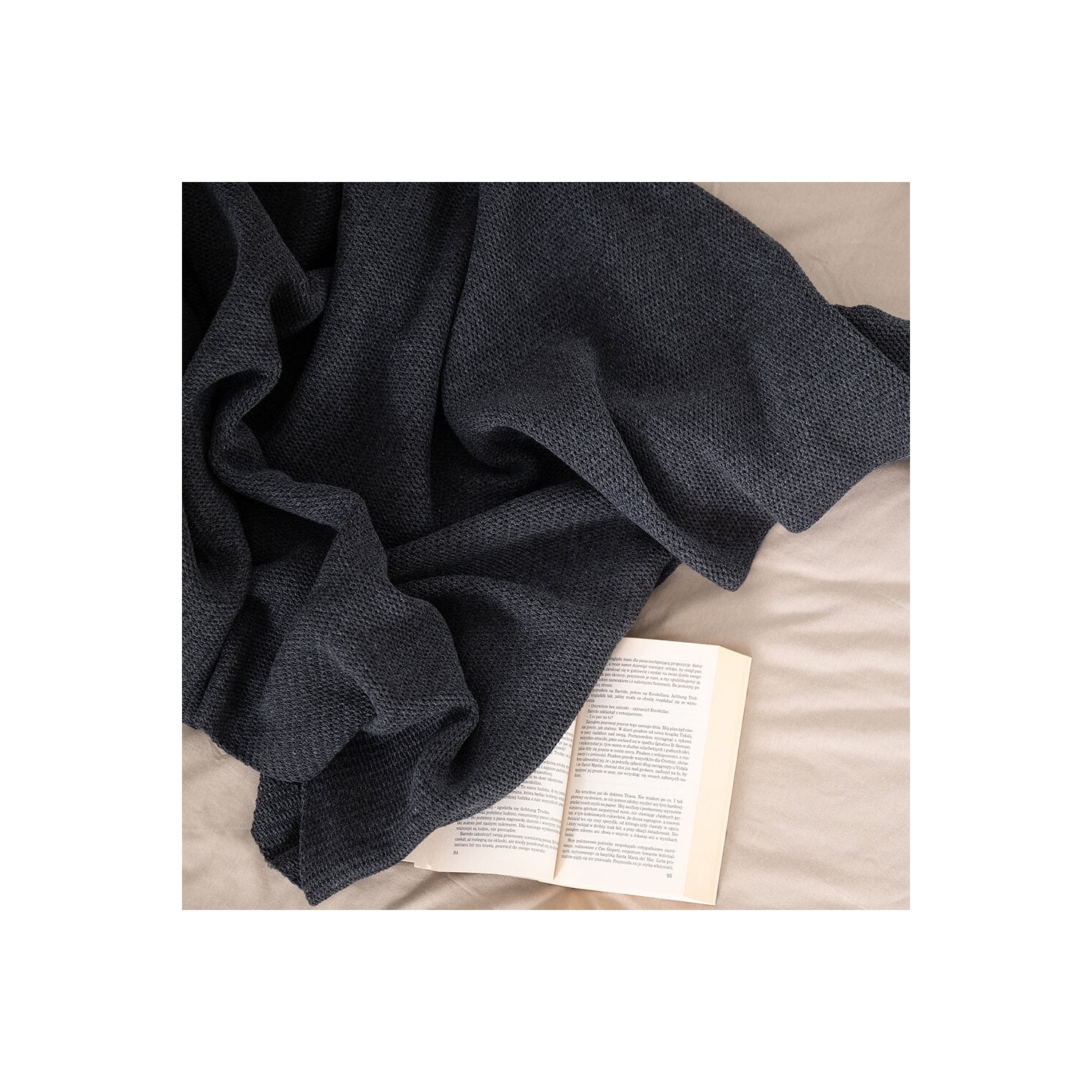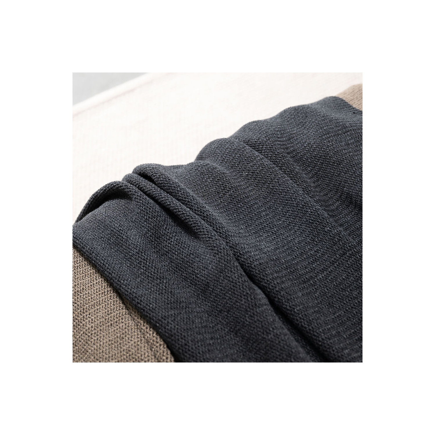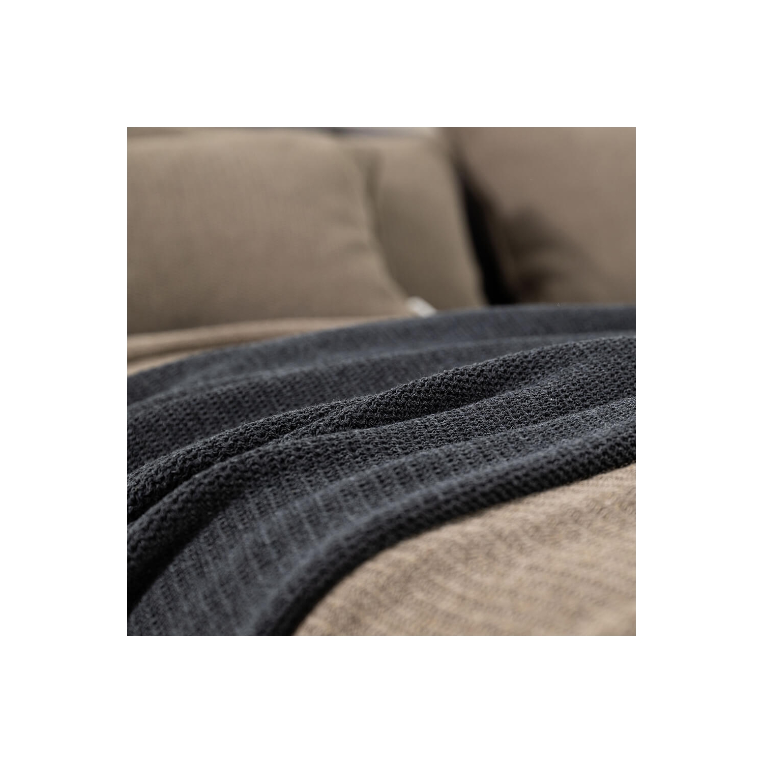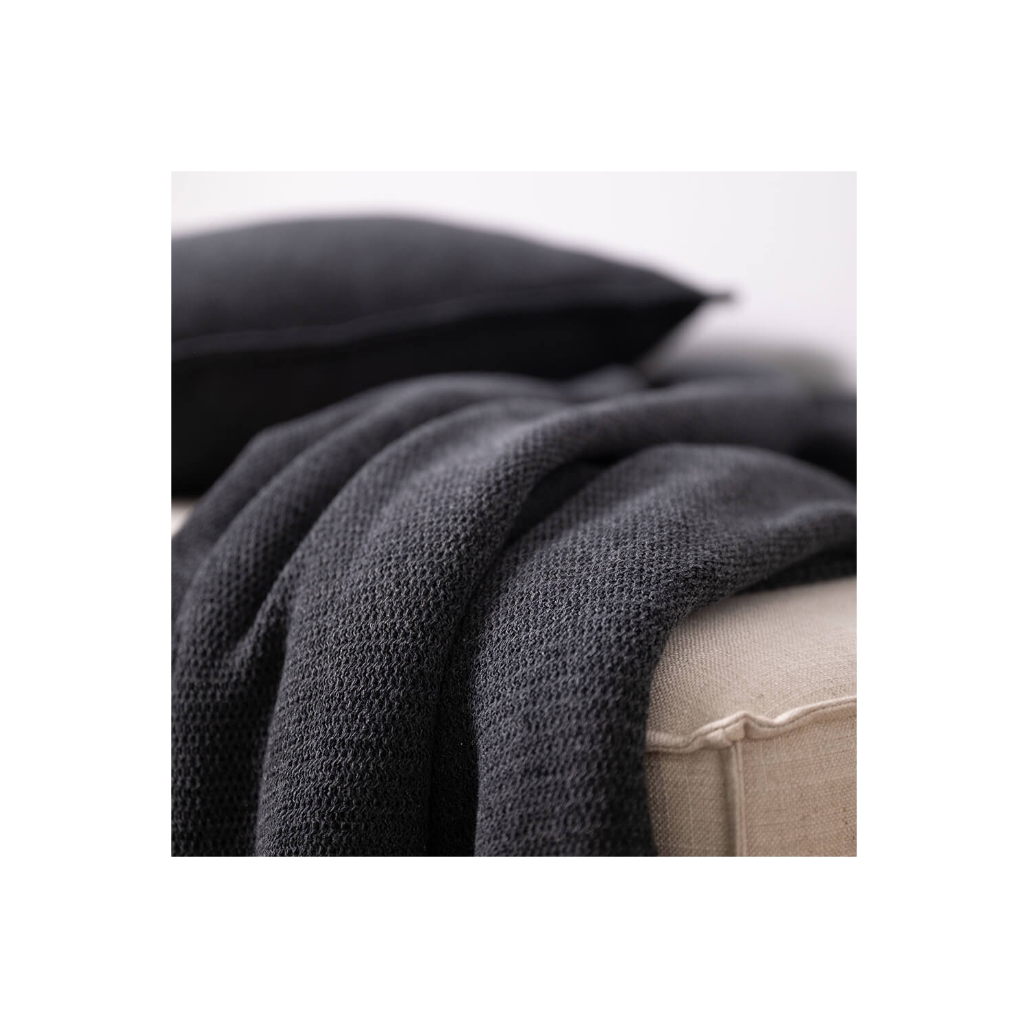 Setzt ruhige Akzente auf Sofa und Bett; Dekokissen in Graphit mit feiner Webstruktur aus recyceltem Baumwollgarn.