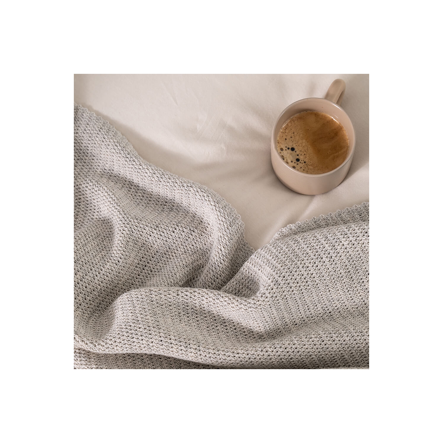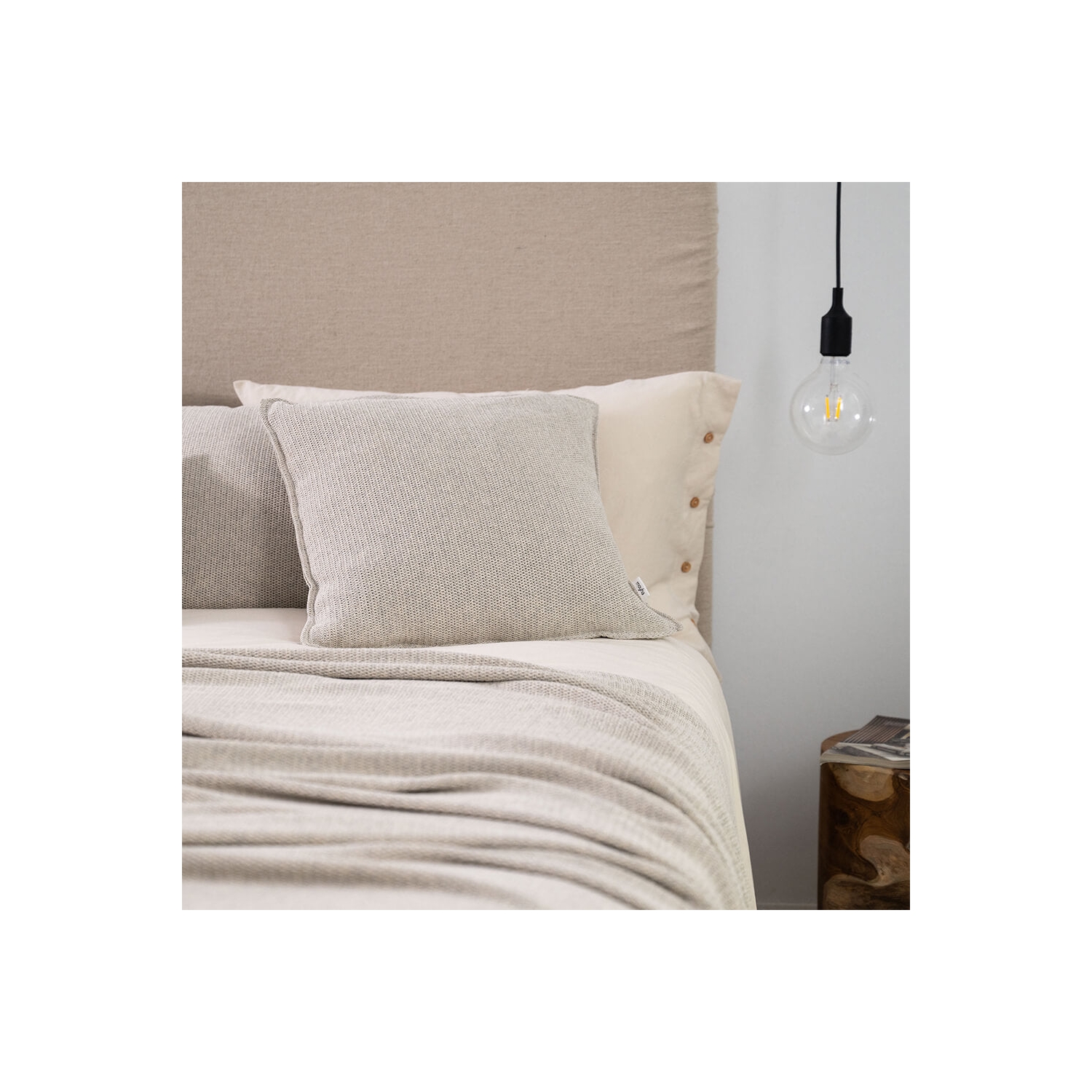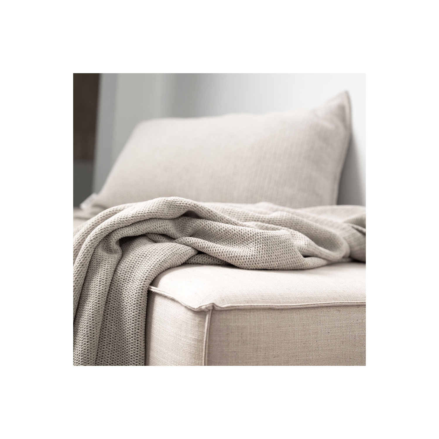 Setzt ruhige Akzente auf Sofa und Bett; Dekokissen in ecru Sand mit feiner Webstruktur aus recyceltem Baumwollgarn.